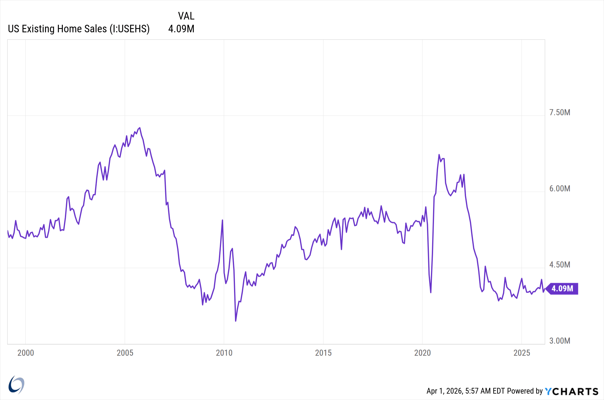 Sales of existing homes have hovered around post-housing bubble levels in absolute terms for the past two years.